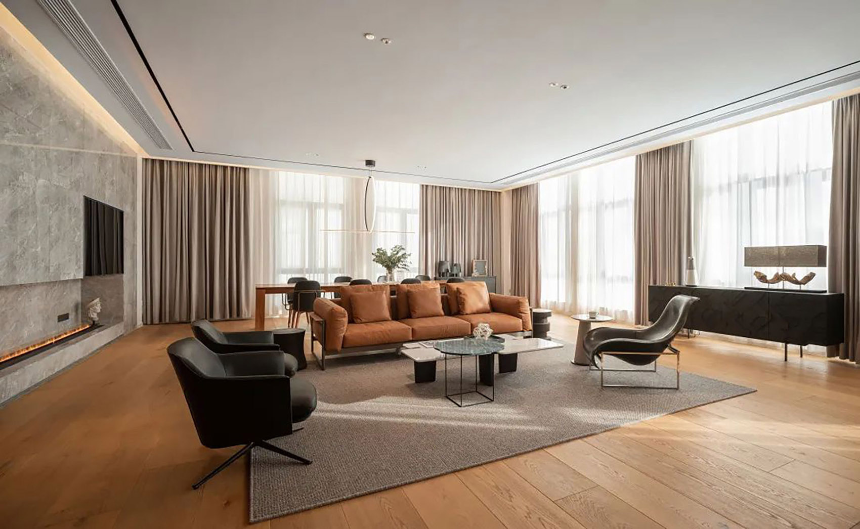 總經理辦公室,以黑色和橘棕色的家具為主,灰色大理石墻面精致而冷峻,LED仿真壁爐增添了幾分溫暖和閑適,通過材質的運用和軟裝搭配讓空間兼具時尚與質感。不管繁雜的工作如何變化,都能讓公司有機地不斷向上成長。