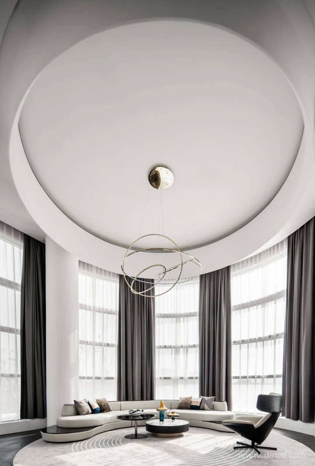 設計師對變化無窮的自然現象的癡迷轉譯成了設計的一部分,海水跟隨潮汐的起落呈現出不同的形態,空間亦是如此。點點星光投射在形狀各異的天花裝置上,靈動而富有生機,層層曲線自由流淌在天花之上,與地面的那一抹藍呼應。