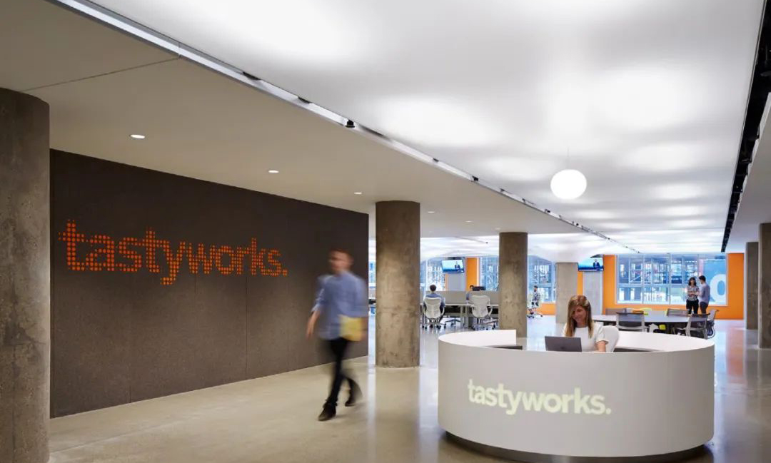網絡證券公司Tastyworks的芝加哥辦公室,是一棟冷庫改建的辦公大樓。接待區的Logo 墻面,設計選用了Filzfelt棕色的200和橙色的151色號羊毛毛氈,雙層疊加后在表層飾面精確鏤空,將Tasty Works公司的logo通過底層明亮的橙色毛氈透出,克制而不張揚。