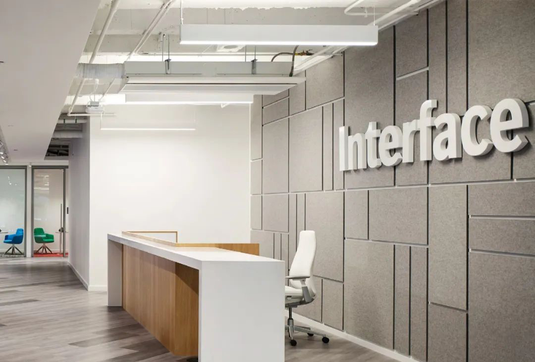 地毯品牌Interface在亞特蘭大的總部,Perkins+Will選擇了靜謐灰作為Logo墻主色調,并選擇了Filzfelt的Akustika 10 Wall墻面吸聲系統,降噪系數高達0.75.